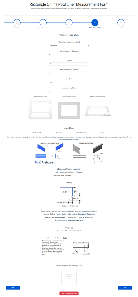 And finally, you’re presented with options for your skimmer, drains, bead, closeout seam, and coves. You can even upload photos of your pool at this point.