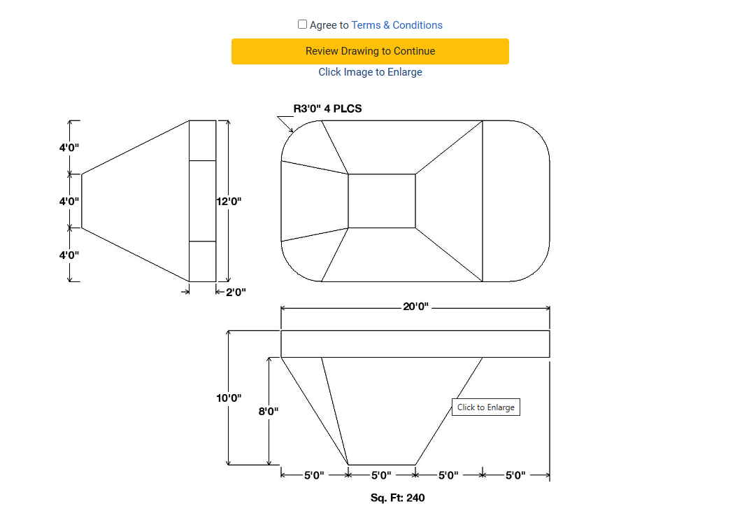 Now that you’ve entered all of your pool details, you can click the “Review Drawing” button to generate a drawing based on your dimensions. I’m not using any fancy libraries here, just basic PHP GdImage functions and lots of linear algebra.