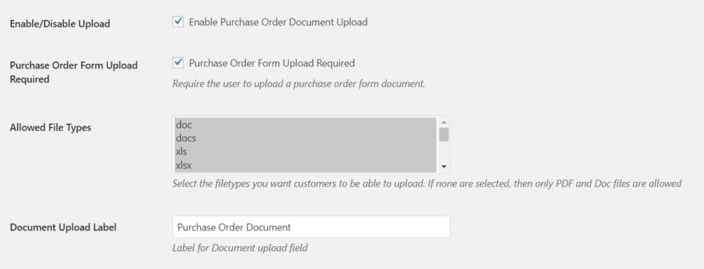 Adds functionality to the Purchase Order Gateway to allow the customer to upload a reference document and make the upload optional or required. You an also choose the file formats accepted.